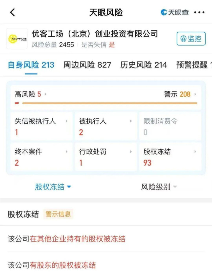 天眼查显示,目前优客工场共有5条高风险警示,最新的是6月16日,优客工场再次被列为失信执行人。